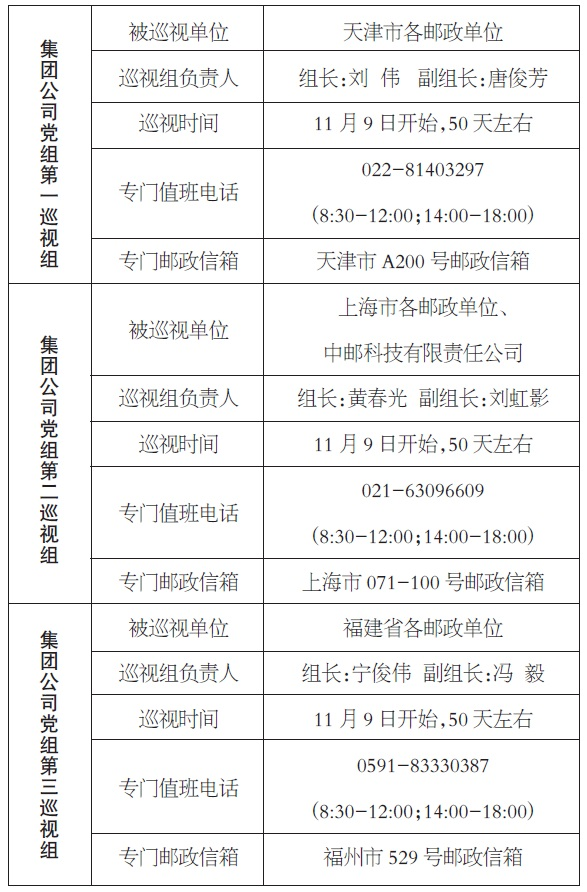 集團公司黨組首批巡視對集團公司天津市、上海市、福建省分公司,郵政儲蓄銀行天津、上海、福建省、廈門分行,中郵人壽保險公司天津、上海分公司,中郵證券公司上海、福建分公司,中郵科技有限責任公司等12個單位的黨委(黨組)領導班子及其成員開展常規巡視。