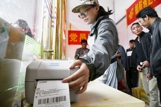 郵政“黨員突擊隊(duì)”隊(duì)員在為客戶打印面單。