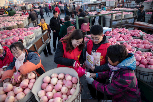 進入生產旺季,山東省棲霞市郵政分公司機關各職能部門、專業部門黨員和入黨積極分子共20多人組成了機關黨員突擊隊,他們身著“黨員志愿者”紅馬甲,活躍在蘋果收購市場、街道小區、農戶家中,支撐旺季業務發展,用實際行動踐行了“一個黨員就是一面旗幟”的莊嚴承諾。圖為該分公司機關黨員突擊隊到蘋果收購市場,為果農送上暖手、暖身、更暖心的熱水、熱豆漿、熱雞蛋、勞保手套,幫助果農抬蘋果,并提醒他們“蘋果款要及時存到正規銀行,以防被偷盜、被詐騙”。 □張紅霞 唐子清 攝影報道