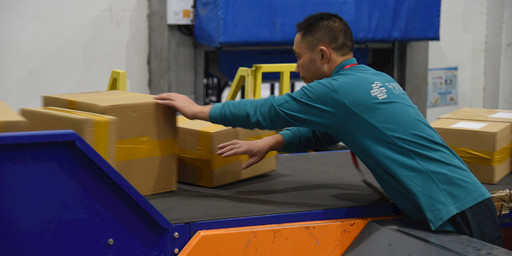 走進(jìn)包裹處理場地,平時在上午略顯冷清的設(shè)備上,到處可見大大小小的包裹隨著機(jī)器皮帶流動著。在皮帶分揀機(jī)前,鮑光前遇到了一群身著紅馬甲的郵政人。“感謝各位黨員志愿者今天來中心局幫忙網(wǎng)運(yùn)工作。這會兒皮帶分揀機(jī)缺少供件人員,5個人留在這兒,其余的和我一起去幫忙把剛送來的郵件拉到分揀區(qū)來。”說完,鮑光前又帶著大家往場地的另一端跑去。