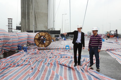 鄭硯平(左)于通車前夕再次來到南沙大橋施工現場做貸后檢查。張軼博 攝