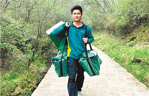 謝菲俊所在投遞班的班長林鵬舉告訴記者,黃山風景區內山路崎嶇,無法行車,每天都要人力背負重物翻山越嶺。謝菲俊一干就是3年多。