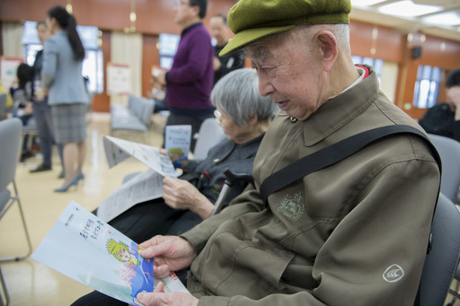 南京市民仔細(xì)閱讀世界郵展宣傳冊。→