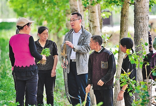 郝軍在田間地頭向種植辣椒的貧困戶教授辣椒種植器使用方法。對這塊試驗田,他們3人有個約定,最終利潤要向貧困戶分紅。