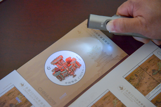 為了將世界郵展元素打印到小型張上,河南省郵電印刷廠設計針孔裝飾方式將“CHINA2019”元素打印到小型張上。目前世界上使用的最小郵票針孔為0.7毫米,河南省郵電印刷廠攻克技術難題,制作出0.6毫米針孔,成功應用于此次世界郵展郵品上。