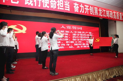 會議表彰了全省郵政先進基層黨組織、優秀共產黨員、優秀基層黨組織書記和優秀黨務工作者,舉行了省分公司直屬機關預備黨員入黨儀式,觀看了講述黑龍江先進典型事跡的專題教育片《楷模》。圖為預備黨員在黨旗前鄭重宣誓。 □鄭添木  攝影報道