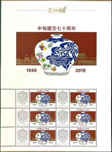 為慶祝中國與匈牙利建交70周年,匈牙利于5月23日發行了一套《中匈建交七十周年》紀念郵票(圖4),并在匈牙利國家行政大學內舉辦了發行儀式。該套郵票共有2枚,由來自中國的趙文潔和匈牙利的設計師瑪媞·阿萊克絲分別設計1枚,在兩枚郵票的背景當中都能看到中國天安門和匈牙利國會大廈的部分圖形元素。匈牙利設計師采用了中國的祥云作為主要圖案,并在紀念周年的數字中融入了匈牙利的傳統刺繡花紋。中國設計師表示瓷瓶代表著“平安與和平”,圓形瓶體則代表著“友好與圓滿”,并將中國牡丹以及匈牙利傳統花卉圖案與青花瓷瓶相結合,象征兩國政府和人民之間親切、緊密的友誼。