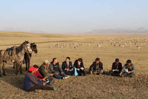 郵儲銀行工作人員在巴音布魯克草原上做業(yè)務宣傳。