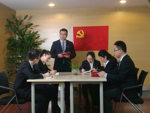 北京分行機(jī)關(guān)黨支部書(shū)記皮震環(huán)(左三)結(jié)合黨的十九大精神為黨員講黨課。