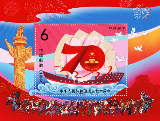中國郵政定于2019年10月1日發行《中華人民共和國成立七十周年》紀念郵票1套5枚,小型張1枚。郵票圖案名稱分別為:經濟持續健康發展、社會主義民主政治推進、文化繁榮興盛、人民生活不斷改善、建設美麗中國,小型張圖案名稱為:祝福祖國。全套郵票面值為12元。