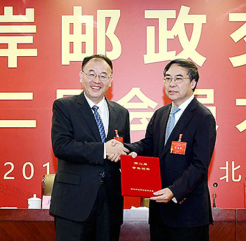 國家郵政局局長馬軍勝向集團公司董事長劉愛力頒發海峽兩岸郵政交流協會第二屆會長證書