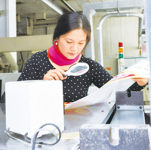 郵票設計者原藝珊查看郵票印制情況。 記者 陸航 攝