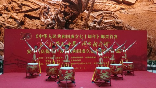 10月1日15時(shí),由中共安徽省委宣傳部、安徽省郵政管理局、安徽省郵政分公司、安徽省集郵協(xié)會(huì)、合肥市文化和旅游局主辦的《中華人民共和國(guó)成立七十周年》紀(jì)念郵票首發(fā)暨“壯麗七十年 闊步新時(shí)代”集郵巡展在渡江戰(zhàn)役紀(jì)念館舉行。活動(dòng)中,安徽省分公司帶來了快閃表演《我和我的祖國(guó)》,全場(chǎng)同唱贊歌,歌頌祖國(guó)。圖為合肥市郵政分公司員工帶來的《鼓舞盛世 揚(yáng)帆遠(yuǎn)航》表演,強(qiáng)勁有力的鼓聲表達(dá)了慶祝新中國(guó)成立70周年的喜悅之情。(徐吉波 攝影報(bào)道)