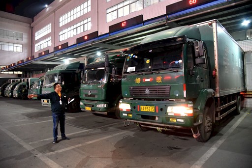 11月11日凌晨,湖北省武漢郵區(qū)中心局調(diào)度員楊成剛忙著指揮車輛進(jìn)出垛口。 □郝振寧 攝影報道