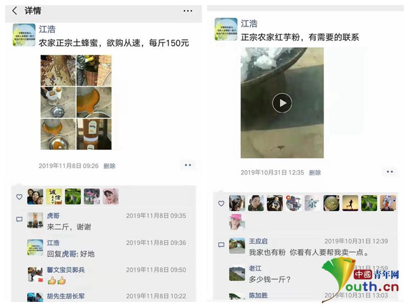 全縣23個(gè)鄉(xiāng)鎮(zhèn)的土豬、土雞、蜂蜜、葛根粉、干菜等土特產(chǎn)在他的朋友圈“輪番出售”。“農(nóng)家正宗土蜂蜜,預(yù)購(gòu)從速,每斤150元。”今年“雙11”之前,江浩在朋友圈“賣貨”,不一會(huì)兒便有買家留言,“來二斤,謝謝!”