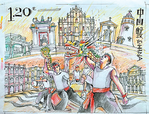 第2枚“中西薈萃 和諧共融”,議事廳前以分別手握龍頭與龍尾的舞醉龍師傅為前景,舞醉龍團(tuán)隊(duì)姿態(tài)各異,相互呼應(yīng),展現(xiàn)澳門舞醉龍的特色。背景為人們熟悉的澳門標(biāo)志性景觀大三巴牌坊、媽閣廟、東望洋燈塔,還有葡韻住宅式博物館。“通過中西建筑物的簡化圖形,反映澳門多元文化色彩和諧共融。在舞醉龍的紅、黃、黑、白等傳統(tǒng)色彩與葡式建筑的橘黃、玫紅與白色調(diào)糅合下,營造出歡快愉悅的氛圍。”韓秉華介紹。