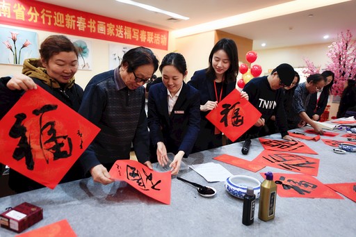 1月9日,郵儲銀行湖南省分行直屬支行內(nèi),書畫家們正為客戶書寫“?!弊趾痛郝?lián)。當(dāng)天,湖南省分行舉辦了迎新春書畫家送福寫春聯(lián)活動。書畫家張青渠、袁紹明、俞成林、張楚務(wù)、胡偉一行來到網(wǎng)點,現(xiàn)場潑墨揮毫,通過寫春聯(lián)、寫“?!弊值姆绞?,送出2020年的新春祝福,共同迎接新春的到來。 □楊伊媛 攝影報道