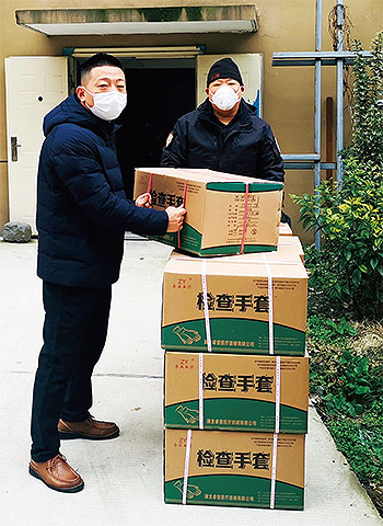 湖北省武漢市東西湖區郵政分公司市場營銷部經理張虎張虎(左)搬運醫療物資。