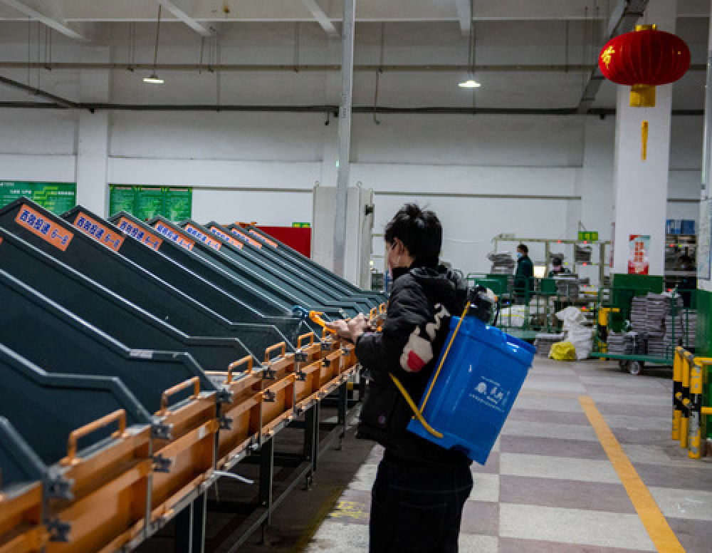 1月31日,在拉薩郵區中心局郵件處理中心,工作人員為郵件分揀機器消毒。 新華社記者 侯捷 攝