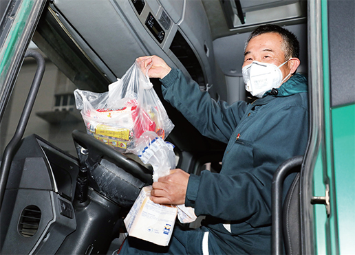 上海郵區中心局黨員駕駛員程勛江展示單位給他們準備的食品,他全程要依靠這些“能量”將防疫援助物資運達武漢。□許雨舟 攝影報道
