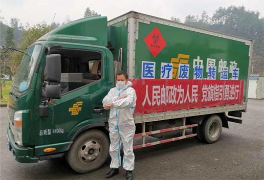 得知消息后,州郵政公司員工、退役軍人尹江、向耀俊、江道權做通家屬工作,主動要求參與轉運工作,火線組建突擊隊,駕郵車出征高危戰場,為定點收治醫院轉運醫療廢棄物。