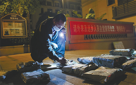 小區(qū)門口沒有路燈,投遞員汪軍只能借著手電筒的微光,一一電話聯(lián)系家長取教材。 李平 攝