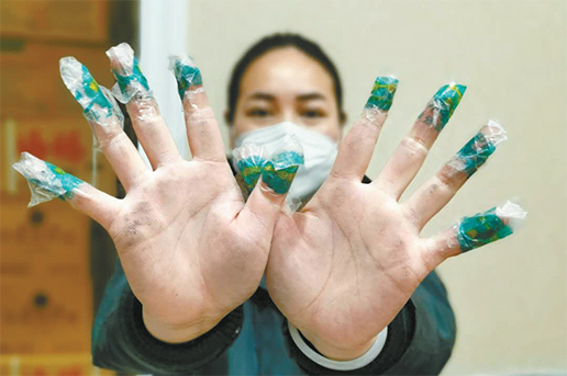 手被劃破,來不及找醫(yī)用膠布,萬州移民廣場郵政所負(fù)責(zé)人蒲春燕就用郵政膠帶包上手指接著打包。譚海霞 攝