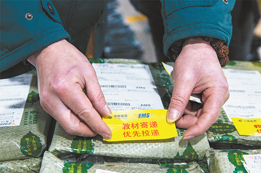 經(jīng)過二次封裝、防水處理之后,處理中心人員為教材貼上寄遞專用標(biāo)簽。朱亞坤 攝