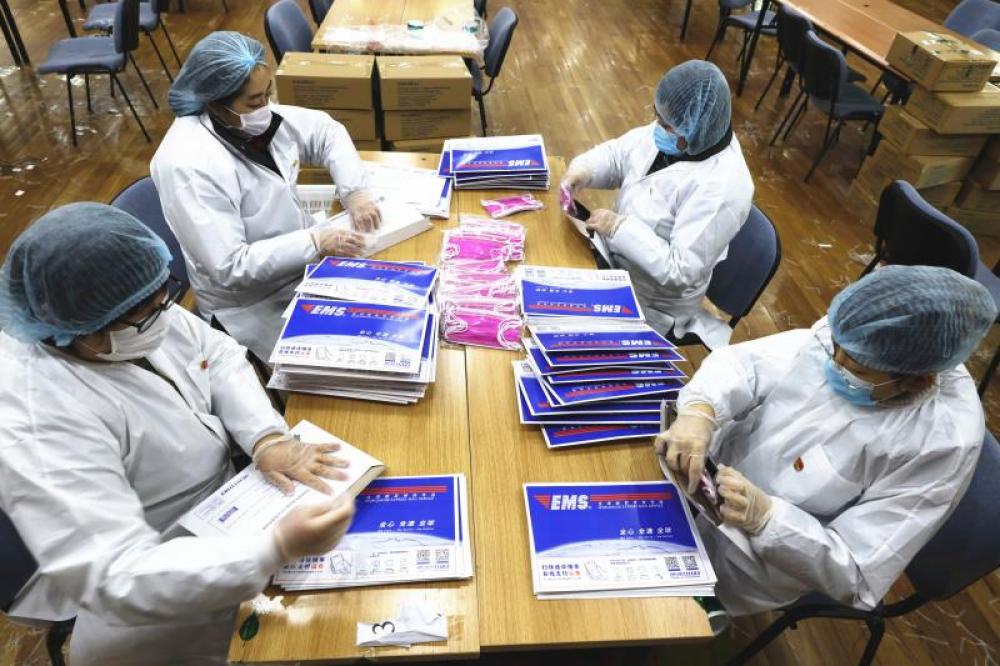 在青島各區市郵政公司攬投部,郵政工作人員根據政務網接收的投遞信息認真核對,并打印快遞單,依次粘貼在裝著口罩的快遞袋上,然后根據地址分配給負責相應投遞段道的投遞員。