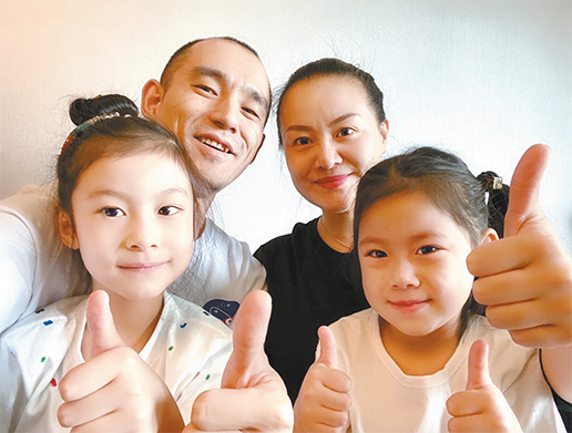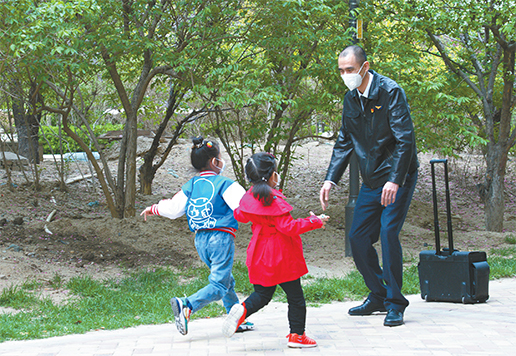 3 月26 日,隔離期滿回家。王曉輝剛進小區,兩個寶貝兒就歡快地迎上前去。