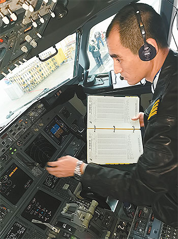 每次起飛前,王曉輝必做的事就是持手冊逐項對照檢查,確保各儀表及設備達到飛行要求。
