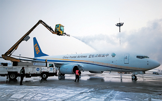 2 月14 日,北京首都機場降雪,王曉輝機長將執飛郵政CF9121 航班奔赴湖北,圖為對飛機進行除冰作業。
