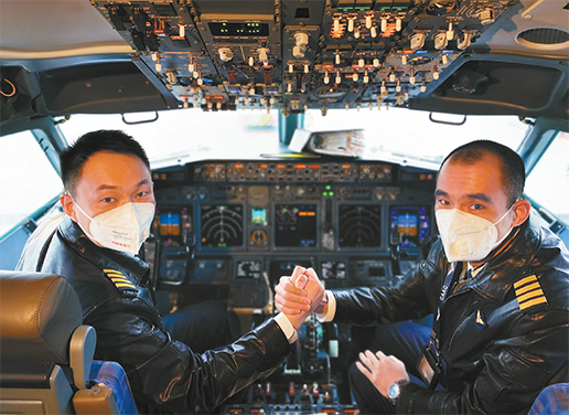 1 月27 日,在首班防控疫情醫療物資專機起飛前,王曉輝和黃宏佳(左)緊握執舵之手,發出“我是共產黨員,我堅守在防控疫情阻擊戰崗位”的心聲。