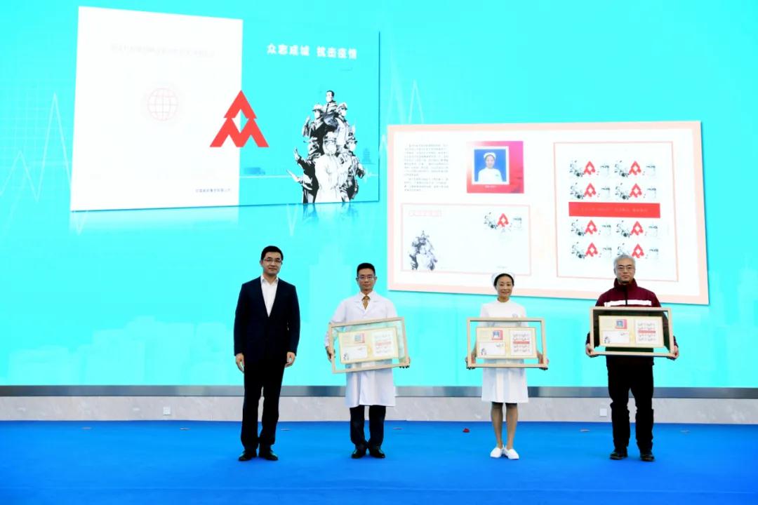 楊傳堂、梁言順、馬軍勝、李斌、梁惠玲、劉愛力、張金良共同為郵票揭幕,中央軍委后勤保障部衛(wèi)生局副局長徐勤耕、財政部經(jīng)濟(jì)建設(shè)司一級巡視員宋秋玲、中國人口福利基金會副理事長武家華、康寧共同為郵票首日封揭幕。劉愛力向中國紅十字會總會捐贈抗擊疫情慈善款,張金良向北京醫(yī)院呼吸與危重癥醫(yī)學(xué)科副主任許小毛,北京大學(xué)人民醫(yī)院護(hù)理部護(hù)士長趙彥,中國疾控中心駐黃岡檢測隊隊長、病毒病所曾毅院士實驗室副主任張曉光三名抗擊疫情醫(yī)務(wù)工作者代表捐贈郵折。