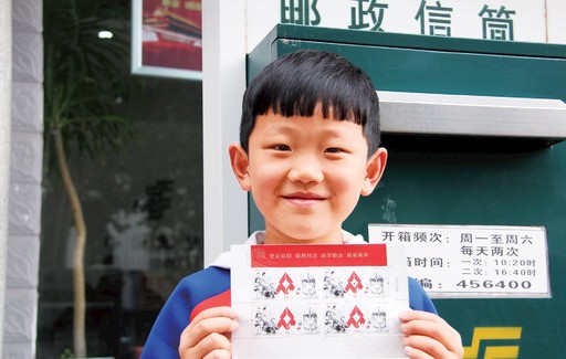 5月11日,河南省安陽市滑縣紅旗路郵政營業廳外,一位小郵迷成功購得心儀的《眾志成城 抗擊疫情》郵票,興奮地展示起來。牟會鋒 攝
