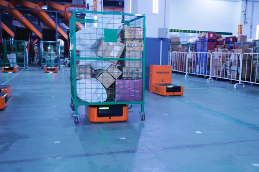在疫情期間,智能搬運機器人(AGV)成了北京郵區中心局重件作業區郵件盤駁工作的主力。鐘山 攝