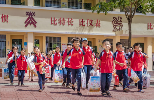 圖為5月30日,海南省分行工會為瓊中縣灣嶺鎮加章村小學送去慰問品,與小學生共同慶祝“六一”兒童節。 □符德勇 攝影報道