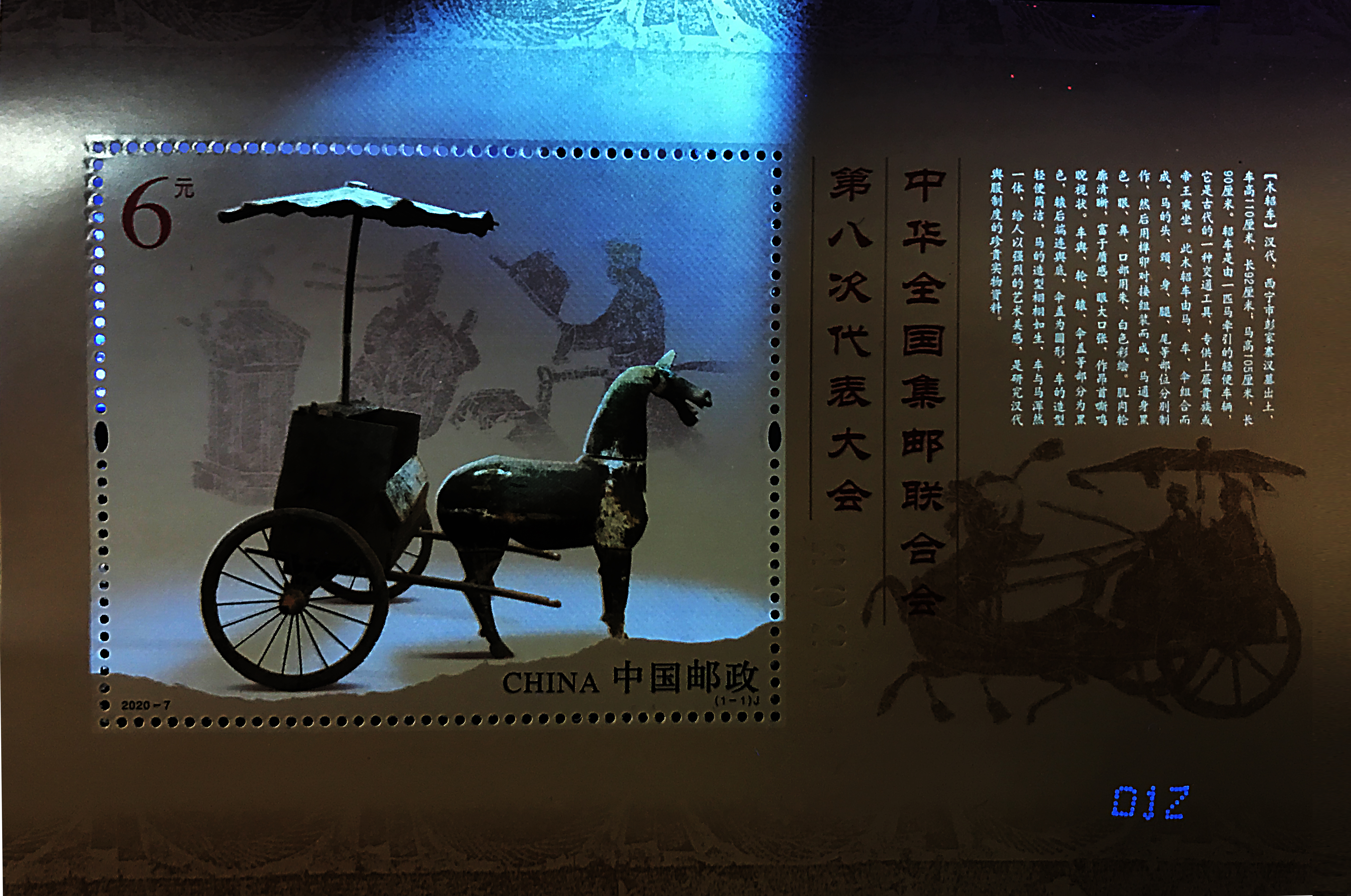 該套郵票由馬立航設計,北京郵票廠影膠套印工藝印制。在印刷方面突破常規,把平凡的技術,做到極致。采用影寫和膠版套印的方式,實現了傳統印制工藝的組合創新。同時,在紫外光下營造出博物館內的觀賞效果,光線匯聚木軺車,明暗交錯,仿佛穿越千年歷史。票面上“2020”的印記,記載下集郵聯八大召開的特殊年份。