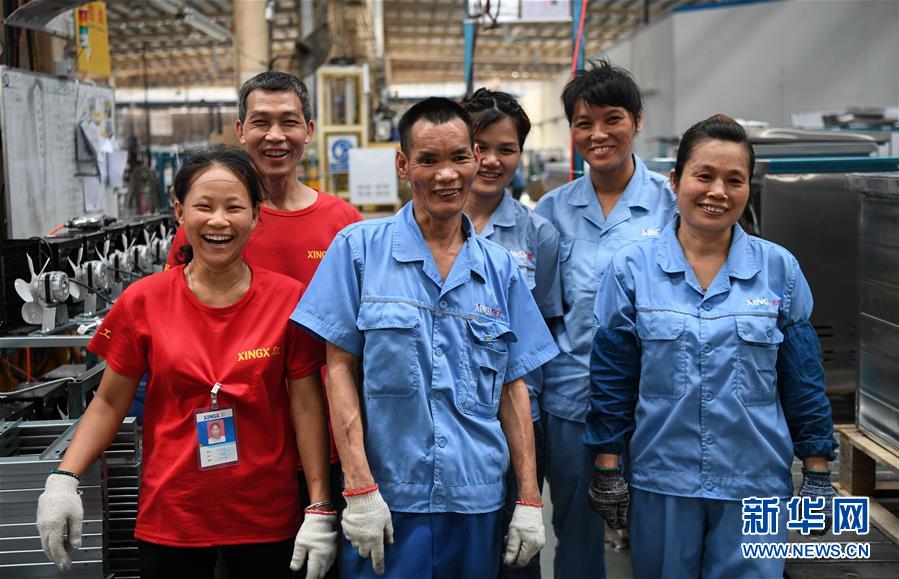 在佛山市三水區廣東星星制冷設備有限公司車間內,來自四川涼山彝族自治州鹽源縣的何公各(左二)和工友們合影(6月22日攝)。 新華社記者 鄧華 攝