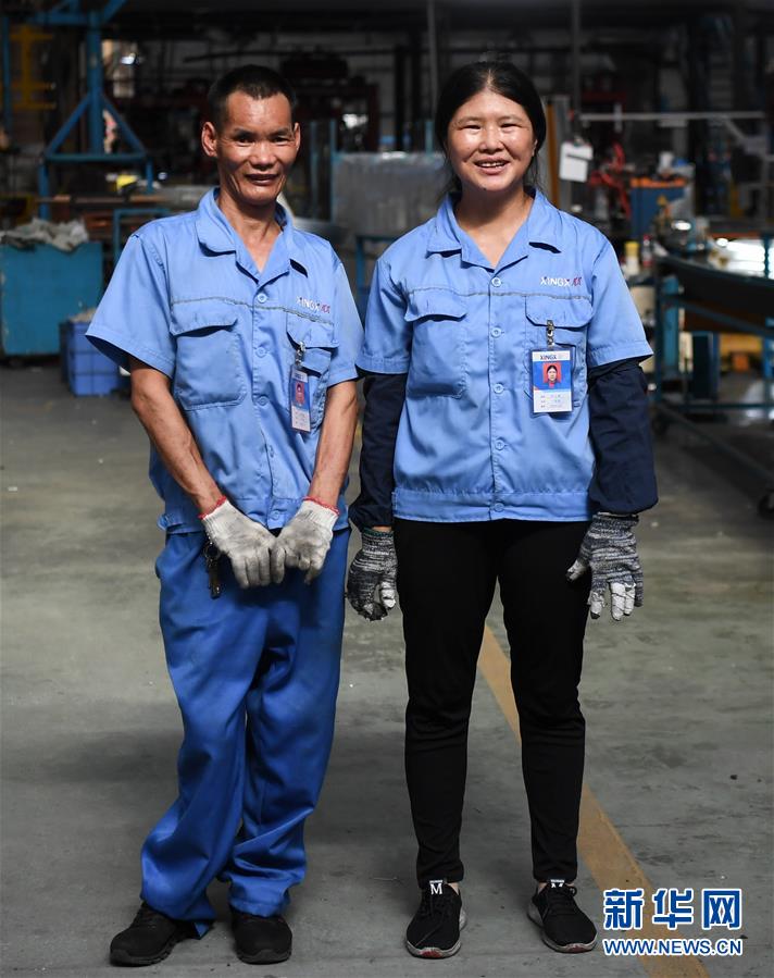 在佛山市三水區廣東星星制冷設備有限公司車間內,來自四川涼山彝族自治州鹽源縣的貧困務工人員李力挖(左)、何公各夫婦合影(6月22日攝)。 新華社記者 鄧華 攝