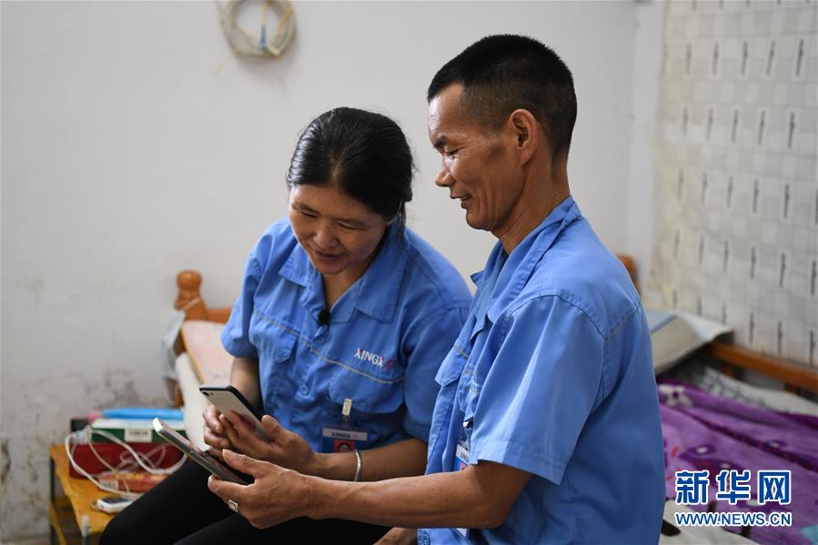 在佛山市三水區廣東星星制冷設備有限公司提供的夫妻宿舍里,李力挖(右)、何公各在休息時間玩手機(6月22日攝)。 新華社記者 鄧華 攝