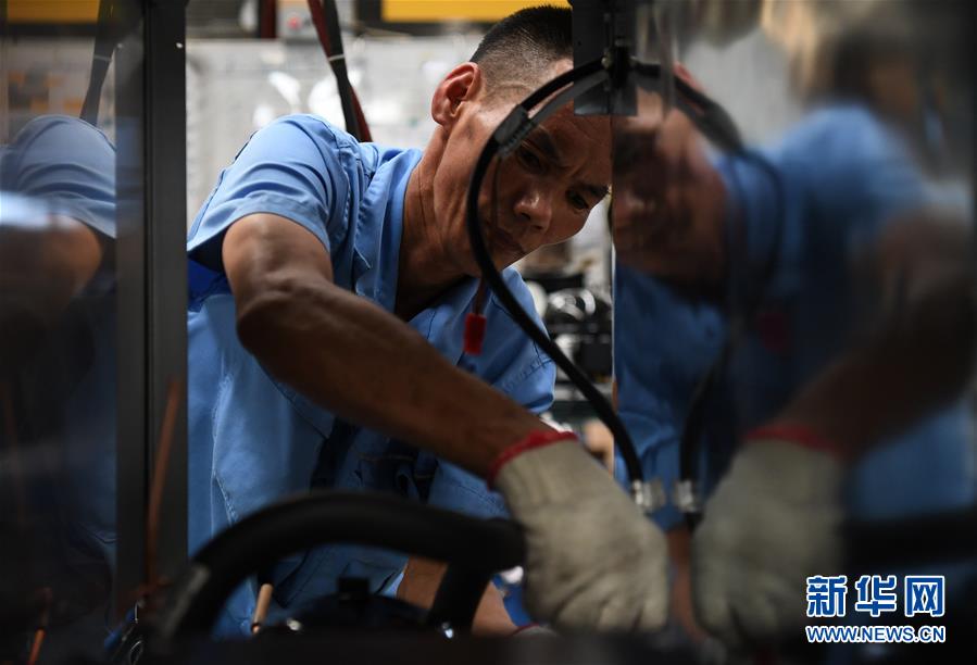 在佛山市三水區廣東星星制冷設備有限公司車間內,來自四川涼山彝族自治州鹽源縣的何公各在組裝設備(6月22日攝)。 新華社記者 鄧華 攝