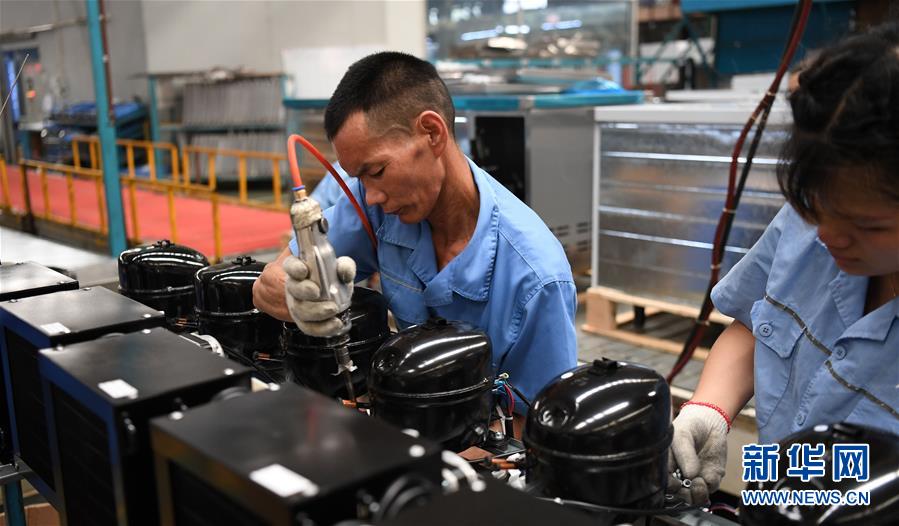 在佛山市三水區廣東星星制冷設備有限公司車間內,來自四川涼山彝族自治州鹽源縣的李力挖在流水線上組裝作業(6月22日攝)。 新華社記者 鄧華 攝