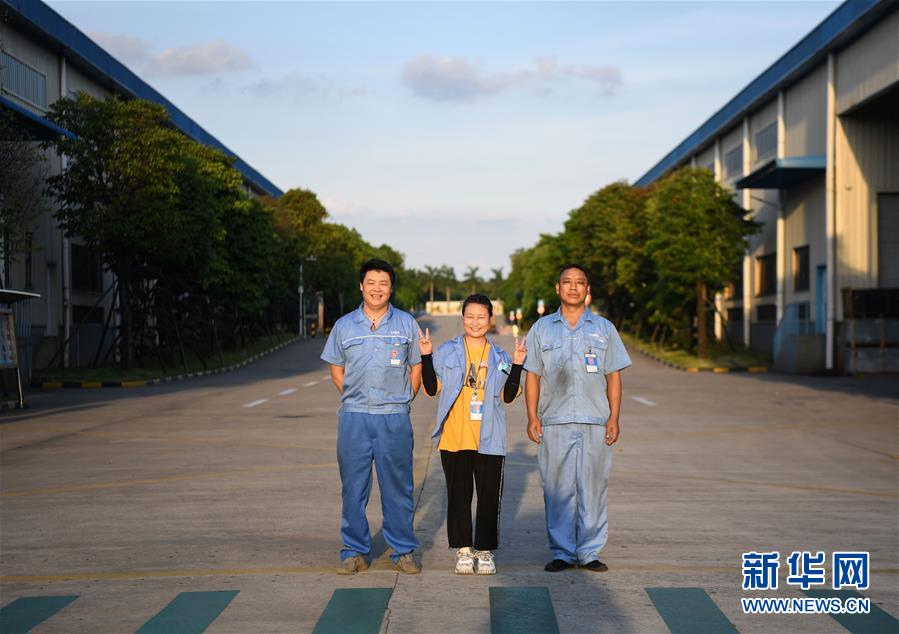 在佛山市三水區廣東星星制冷設備有限公司,來自四川涼山彝族自治州鹽源縣的貧困務工人員伍元國、易爭咪、董正軍(從左至右)下班后在廠區合影,他們通過東西部扶貧協作在這里實現就業(6月22日攝)。 新華社記者 鄧華 攝