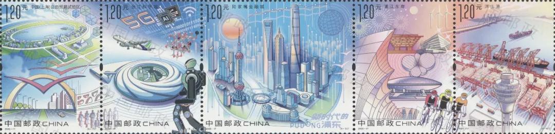 30年來,浦東在一片阡陌農田上建成了一座功能集聚、要素齊全、設施先進的現代化城市,成為我國改革開放的象征和上海現代化建設的縮影。歷史是發展的見證,郵票是時代的剪影。此次發行的《新時代的浦東》特種郵票,鮮活呈現了浦東勇擔國家戰略、奮進新時代的生動實踐,有力彰顯了中國特色社會主義的強大生命力。郵票一套5枚,選取上海自貿試驗區、張江科學城、陸家嘴金融城、浦江東岸、洋山港等作為表現主題,將浦東日新月異的變化濃縮于方寸之間。