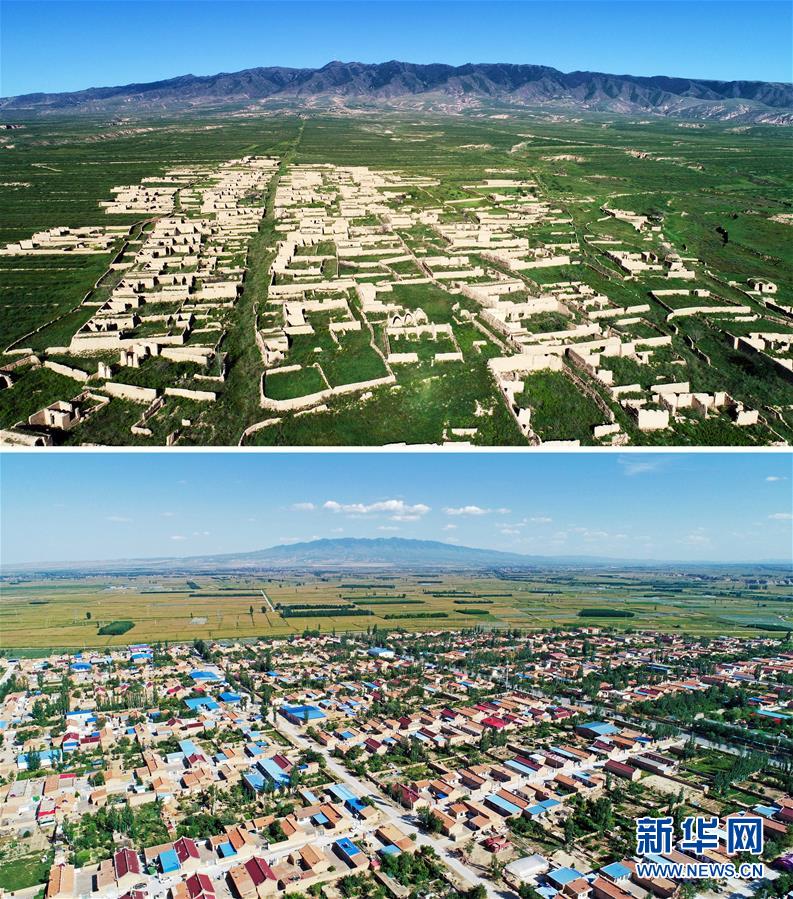拼版照片:上圖為經(jīng)過(guò)多年的生態(tài)修復(fù),寧夏吳忠市紅寺堡區(qū)新莊集鄉(xiāng)移民舊址已逐漸被綠色覆蓋;下圖為戈壁荒灘上建起的紅寺堡移民新村(2018年9月8日攝,無(wú)人機(jī)照片)。 新華社記者 王鵬 攝