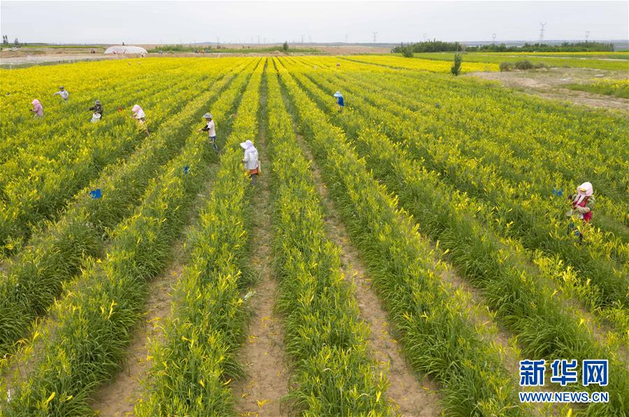 村民在寧夏紅寺堡區(qū)柳泉鄉(xiāng)柳泉村采摘黃花菜(7月11日攝,無(wú)人機(jī)照片)。 新華社記者 楊植森 攝