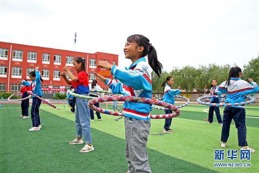 寧夏吳忠市紅寺堡區(qū)紅寺堡中心小學(xué)學(xué)生在體育課上練習(xí)呼啦圈(7月3日攝)。 新華社記者 賈浩成 攝