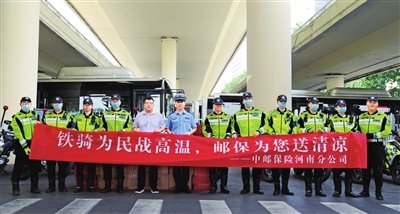 7月29日上午,中郵保險河南分公司開展夏日送清涼活動,為鄭州交警一大隊鐵騎中隊送去礦泉水、洗漱用品等防暑降溫物資,對他們堅守崗位、無私奉獻表示親切慰問,為保障轄區道路交通安全所付出的辛勤勞動表示感謝。
