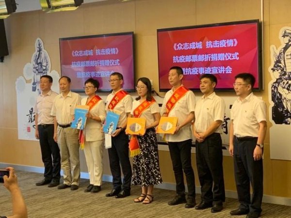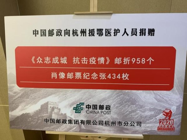 8月20日上午,在杭州郵政分公司大樓的報告廳,由杭州市衛生健康委員會、杭州市市郵政管理局、杭州郵政分公司聯合舉辦《眾志成城 抗擊疫情》郵折捐贈儀式。杭州郵政分公司向杭州援鄂抗疫醫務工作者捐贈《眾志成城 抗擊疫情》郵票郵折共計958套;肖像郵票紀念張434張。此次捐贈給醫務工作者的《眾志成城 抗擊疫情》紀念郵折,是中國郵政特別發行的郵票,用于銘記中國力量和中國精神,并將郵票發行收入捐獻用于救災抗疫。